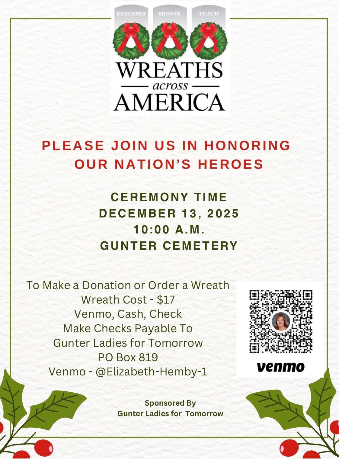 On December 13th, the Wreaths Across America ceremony will take place at Gunter Cemetery to honor and remember our nation’s veterans.