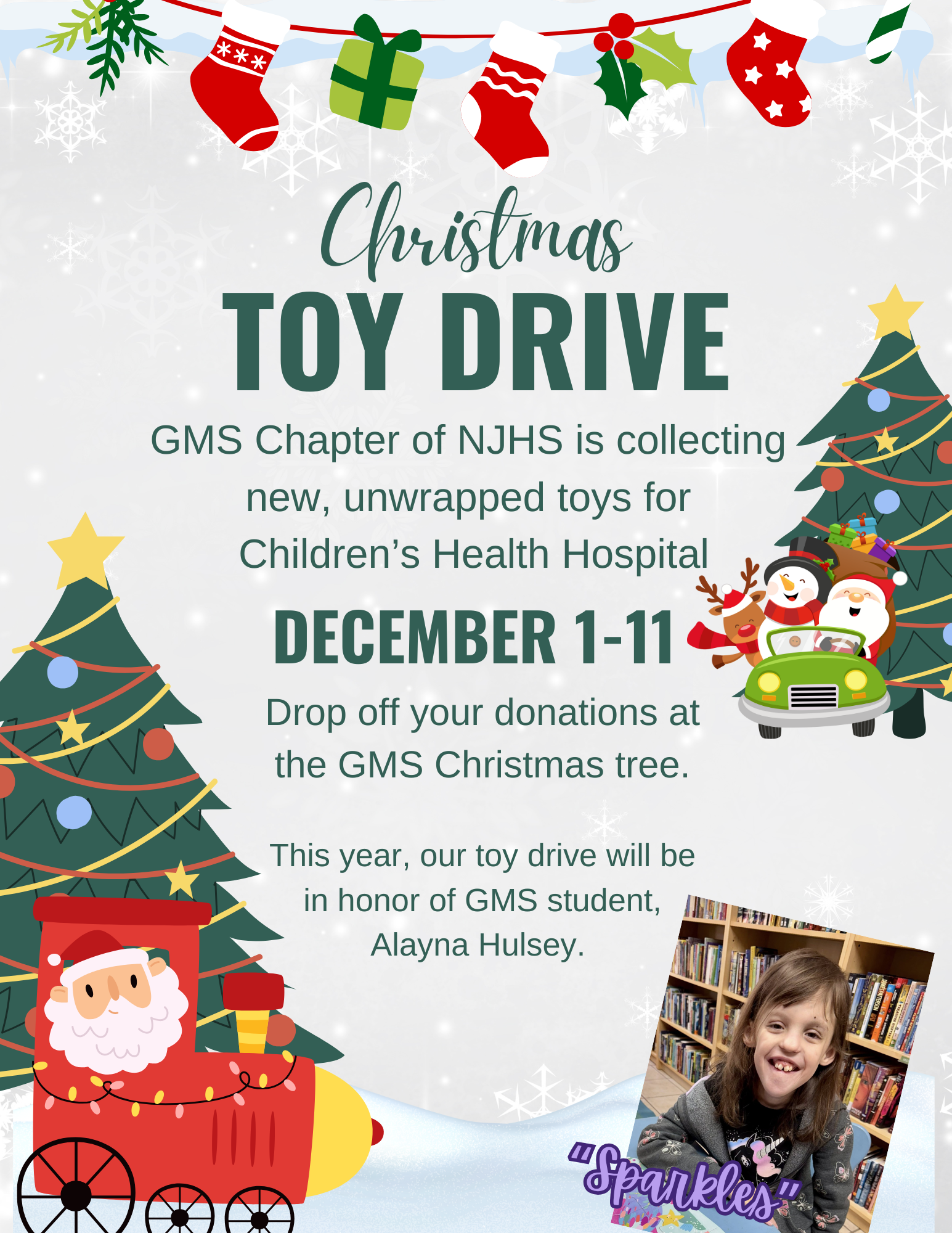 NJHS is hosting a Toy Drive December 1–11 to support Children’s Health Hospital. New, unwrapped toys are needed to brighten the holidays for young patients. This year’s toy drive is held in honor and memory of GMS student Alayna Hulsey, who brought a little sparkle to our school every day. Current Urgent Needs: • Bubbles • Pop Its or Fidgets • Play-Doh • Legos • Barbies • Teethers • Rattles Thank you for helping share joy and keeping Alayna’s light shining. |