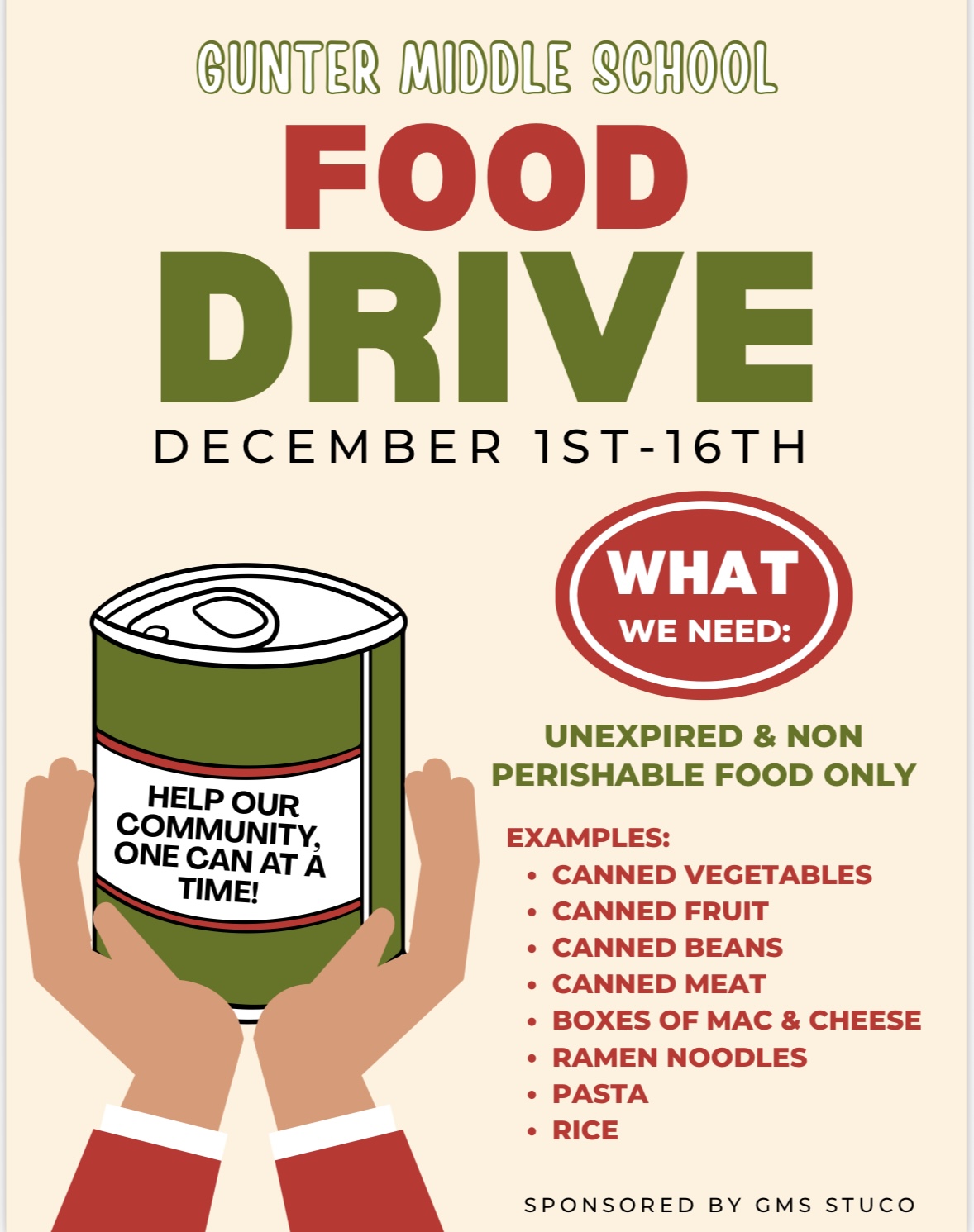 STUCO is hosting a canned food drive December 1–11 to support our local food pantry. Students and staff are encouraged to bring non-perishable food items to help families in our community during the holiday season. Every donation makes a real difference! |