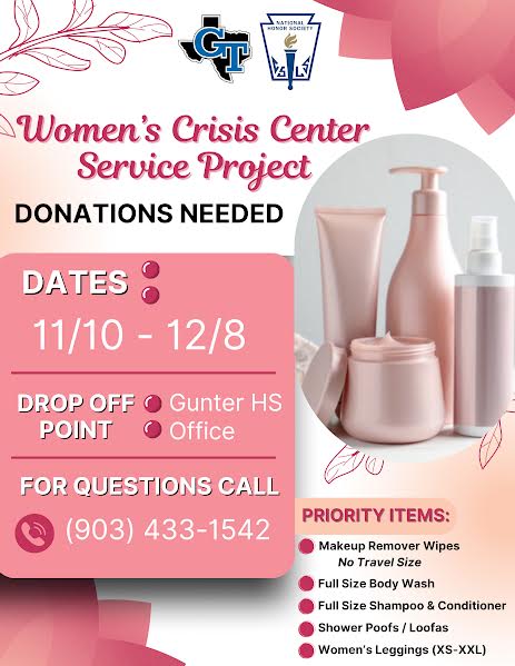 | Gunter High School NHS students are collecting essential items to support the local Women’s Crisis Center. Donations of full size toiletries, personal care products, and household cleaning supplies can be dropped off at GHS through December 8, 2025.. Thank you for helping make a difference! |