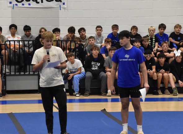 The GMS cheerleaders hosted a spirited Pep Rally celebrating all fall sports and their accomplishments. Athletes took the floor to share highlights and successes from their seasons, while the cheerleaders energized the crowd with impressive stunt and dance routines. The football boys kept the excitement high with their version of the traditional fight song, and students enjoyed a fun sibling race game. The rally wrapped up with a big laugh as Mr. Ferrell was pied as part of a STUCO fundraiser. It was a great day of school spirit and celebration!
