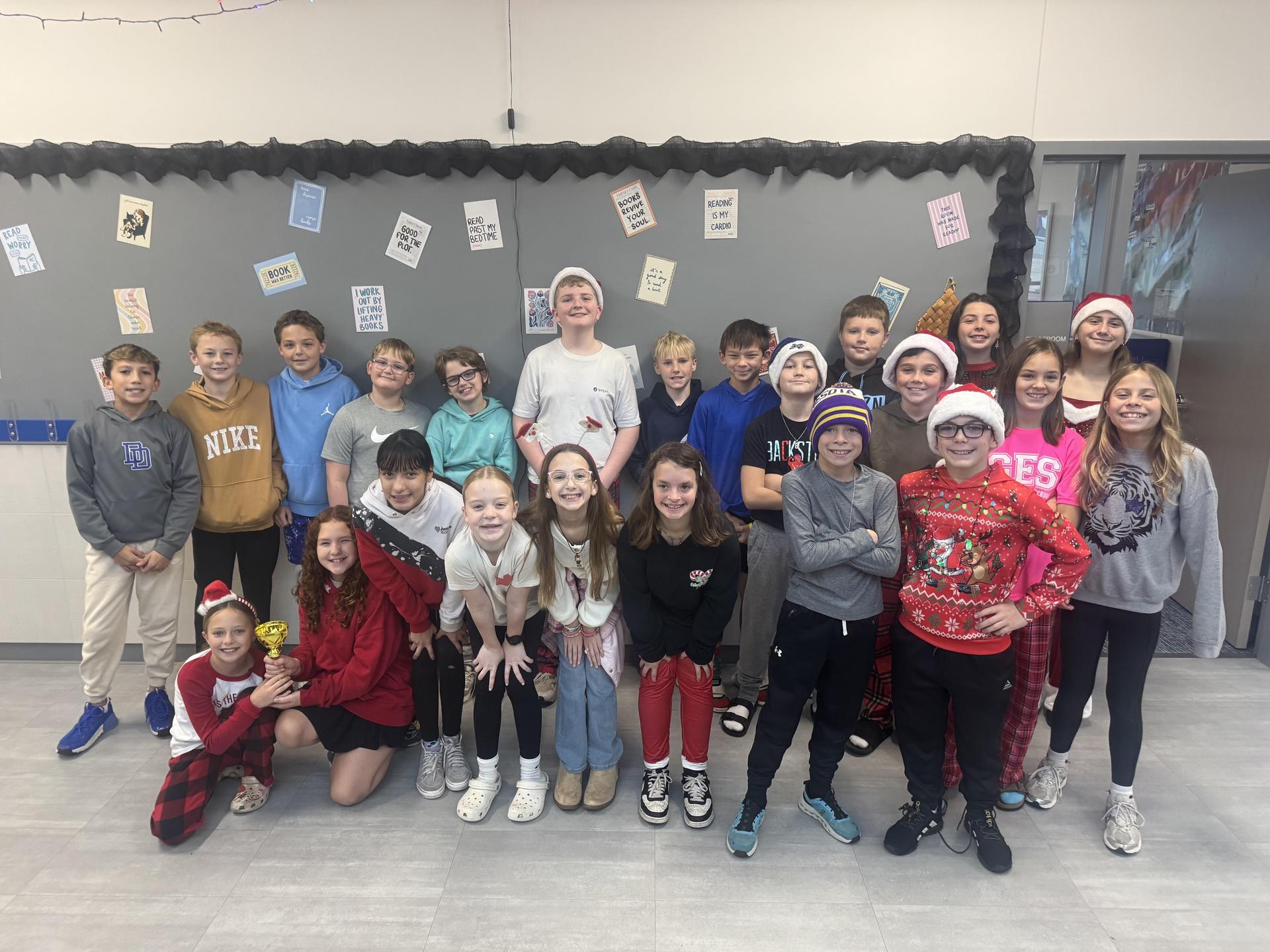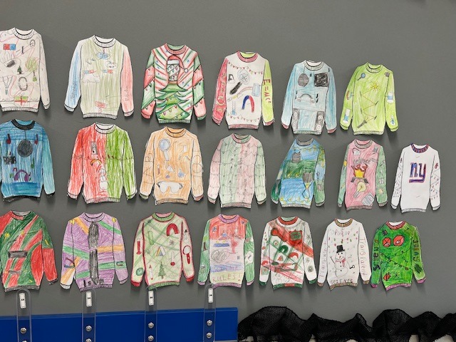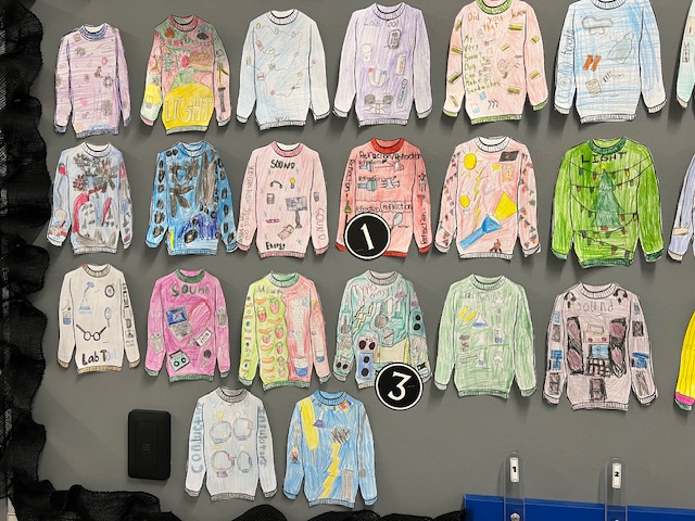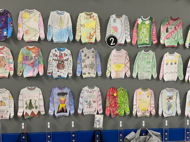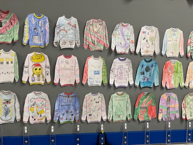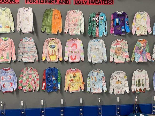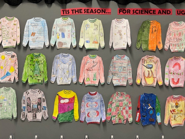 5th grade students in Mrs. Bon's classes showed off their creativity during a festive "Ugly Christmas Sweater" activity, featuring designs inspired by science concepts.. |