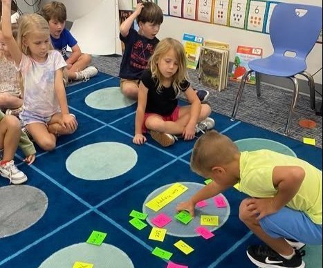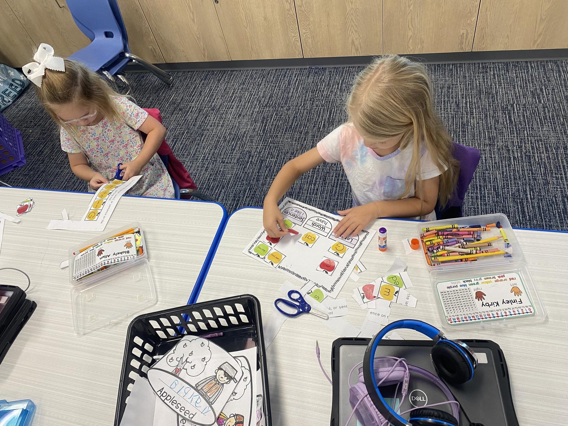 Kindergarten students practiced sorting letters, words, and sentences. Each selected a card to place in the correct category, then practiced what they learned with their own apple sorting activity. Smart work, little learners! |