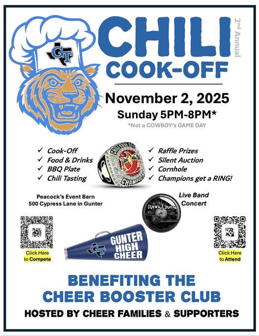 This 21+ event is the perfect night out with friends — all while supporting a great cause. Every dollar raised directly benefits academic programs and classroom initiatives across Gunter ISD, helping ensure excellence for every student. Don’t wait...seats fill up fast, and you don’t want to miss the most exciting night in Gunter! Purchase your tickets and/or tables here. To sponsor the event, click here.