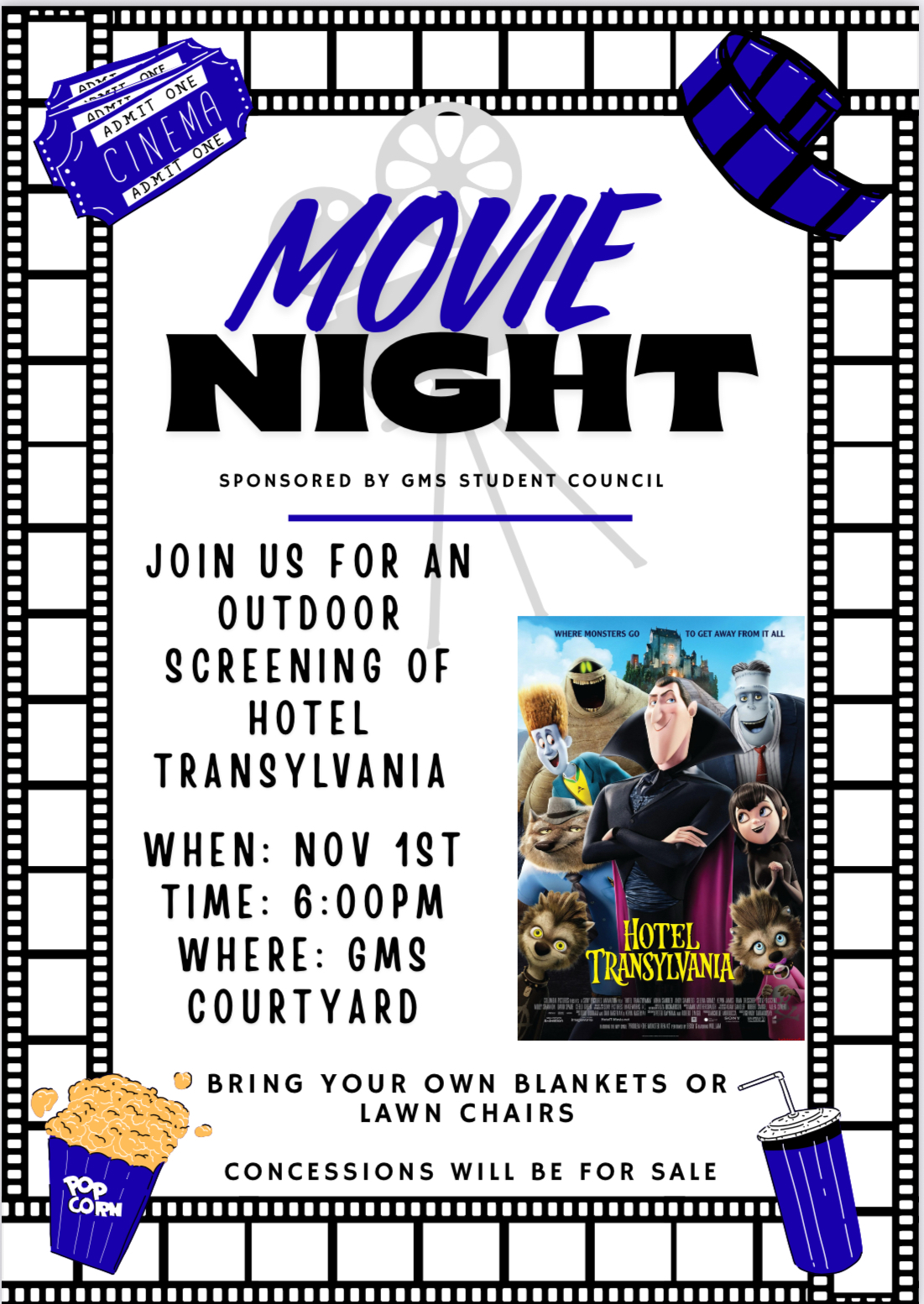 Join us this Saturday, November 1, for an outdoor movie night featuring Hotel Transylvania! Bring the whole family for a fun evening under the stars. Concessions will be available for purchase, sponsored by GMS Student Council.