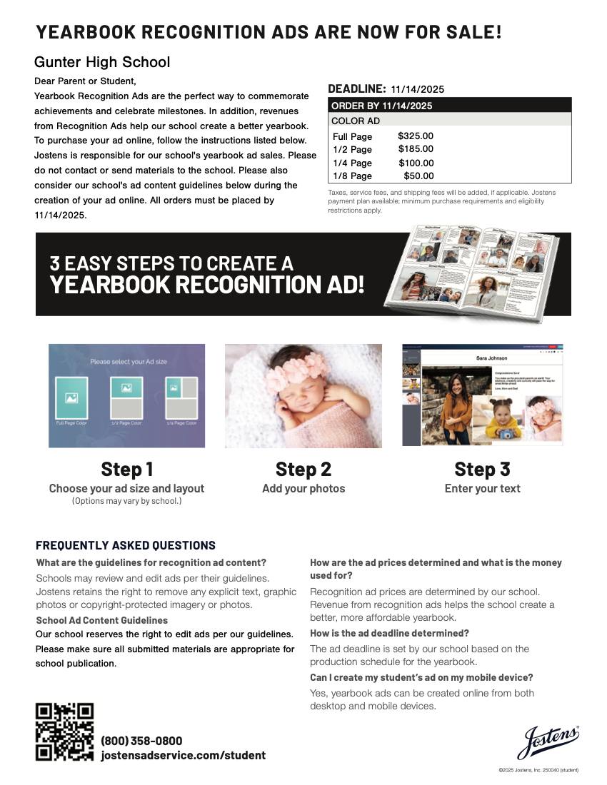 Deadlines for discounted yearbooks and Senior Recognition ads are quickly approaching! Don’t miss out...order your Gunter High School Yearbook today! You can order by clicking this link.