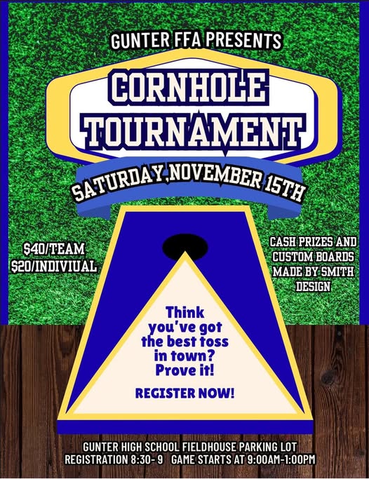 Support the Gunter FFA by signing up for the Cornhole Tournament happening Saturday, November 15th! Join us for a fun-filled day of friendly competition, prizes, and community spirit. Don’t miss out—register today and be part of the action! |